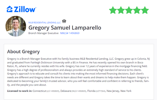 Gregory is a Branch Manager Executive with his family business MLB Residential Lending, LLC. Gregory grew up in Colonia, NJ and graduated from Fairleigh Dickinson University with a BS in Finance. He has operated MLB's Boca Raton, FL branch since 2021. Gregory has over 12 years of experience in the mortgage financing field. Gregory has a high degree of professionalism and always provides an extremely high standard of service to his clients. Gregory’s approach is to educate and consult his clients into making the most informed financing decisions. Each client’s needs are different and Gregory takes the time to learn about their wants and dreams to help make them happen. Gregory is dedicated to becoming your family’s trusted advisor, who you will feel comfortable and confident in referring to friends, family, and the people you care about.